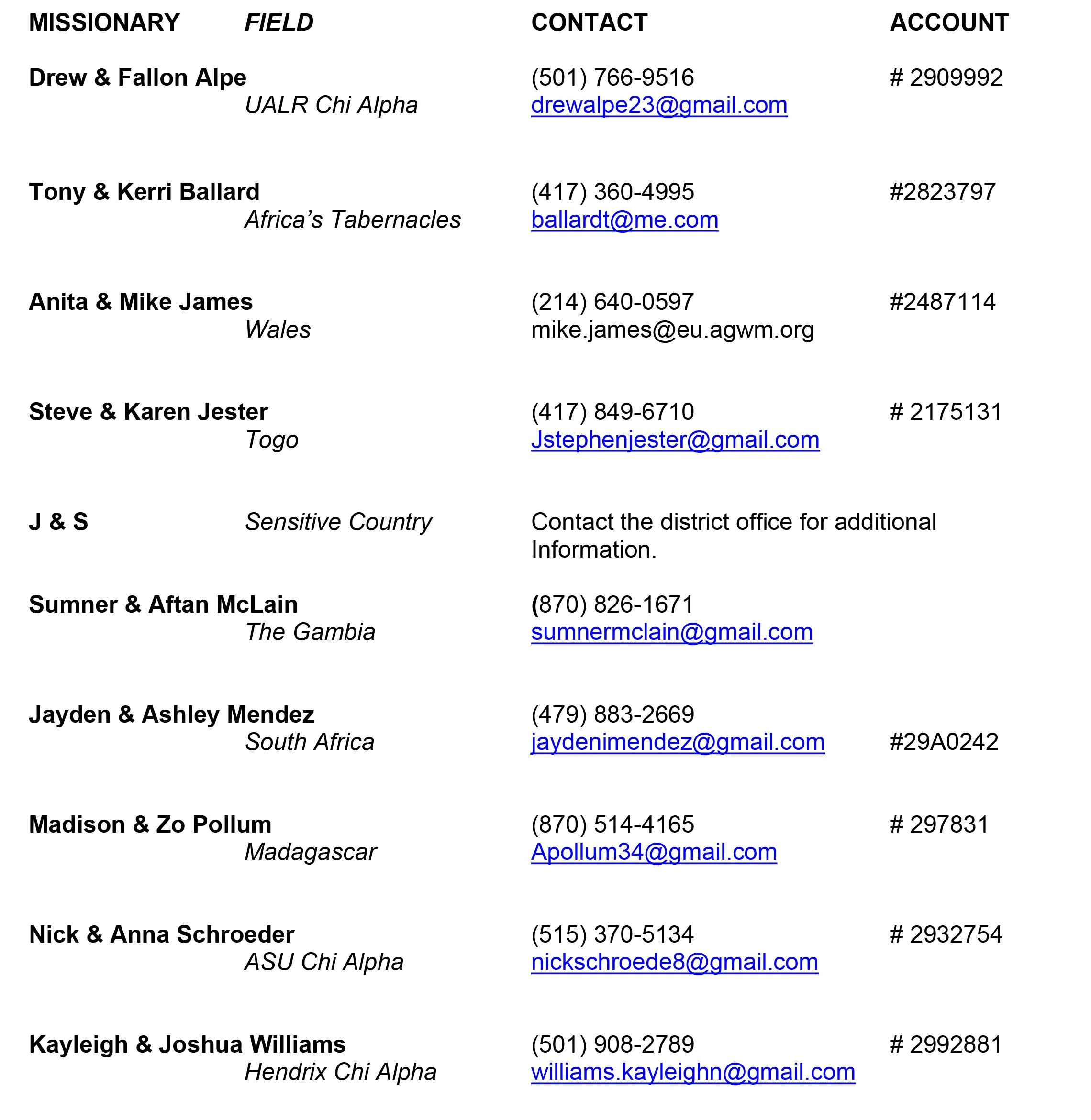 Note: Missionaries in sensitive countries that are returning to the same country are simply listed with just their initials and account #. New missionaries going to sensitive countries are listed by name but their name will be removed approximately one month prior to departure.